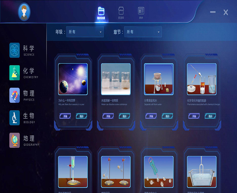 根據國家課程標準中的實驗要求,運用虛擬仿真技術構建虛擬學科實驗室,構建高度仿真的虛擬實驗環(huán)境和實驗操作對象,學生可以自主選擇不同實驗,在虛擬的環(huán)境下進行實驗觀摩、模擬實驗、拓展訓練等操作,在虛擬實驗的互動體驗中更深入的學習知識。虛擬學科實驗室的分類:虛擬化學實驗室、虛擬物理實驗室、虛擬生物實驗室。